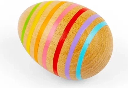 Dit gestreepte muziekeit van natuurlijk hout heeft een gladde, kindvriendelijke vorm die perfect in de hand ligt. Bij het schudden produceert het een aangenaam, zacht rammelend geluid dat het ritmegevoel ondersteunt en de luistervaardigheden ontwikkelt.