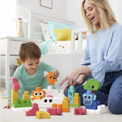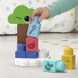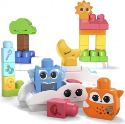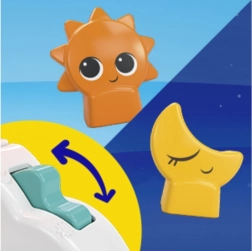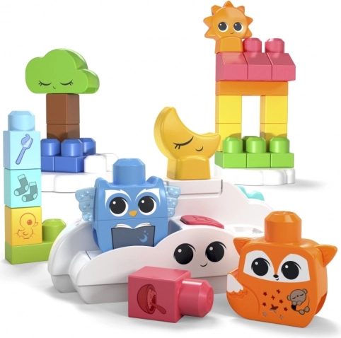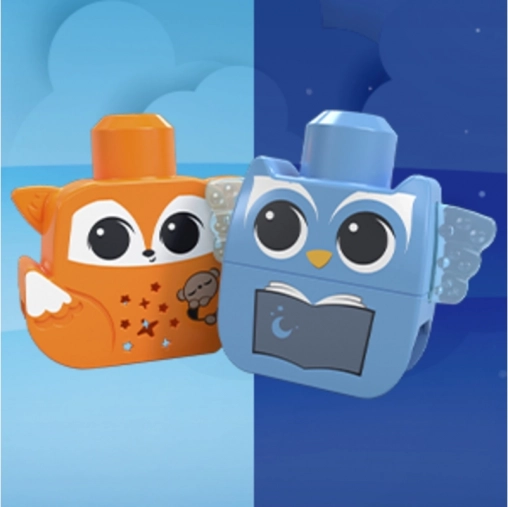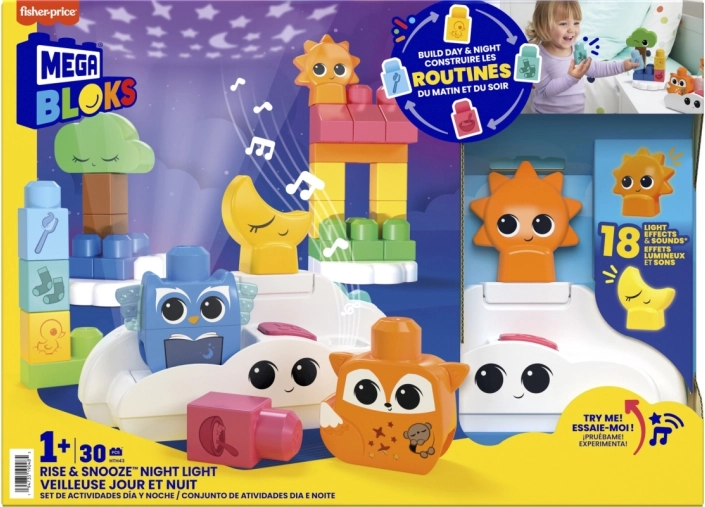 Interactieve Mega Bloks-set met nachtlampje helpt kinderen een gezond ochtend- en avondritueel te ontwikkelen. Bevat 4 figuurtjes en een bouwbare omgeving. Op het nachtlampje kun je een maan- of zonblok plaatsen en wiegmelodietjes, zachte geluiden, lichteffecten en een sterrenprojector voor de avond starten, of optimistische liedjes, omgevingsgeluiden en zonpatronen voor de ochtend. Ideaal voor kinderen vanaf 1 jaar.