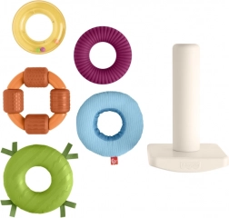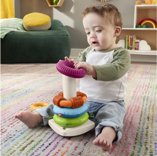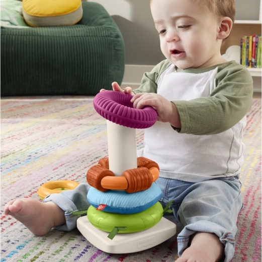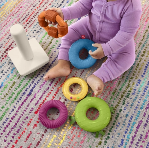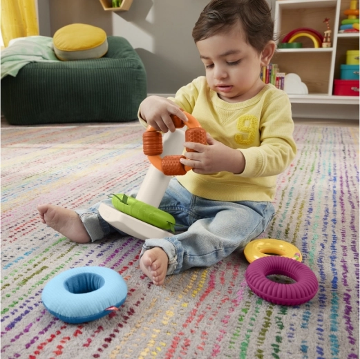 De Fisher-Price sensorische stapelpiramide is een moderne versie van het klassieke speelgoed met een wiegende basis en vijf ringen in verschillende maten. Elke ring biedt een andere tactiele ervaring – van zachte materialen en uitgesproken structuren tot kraaltjes die rammelen. Kinderen ontwikkelen hun vaardigheid op een natuurlijke manier: grijpen, schudden, sorteren en stapelen.