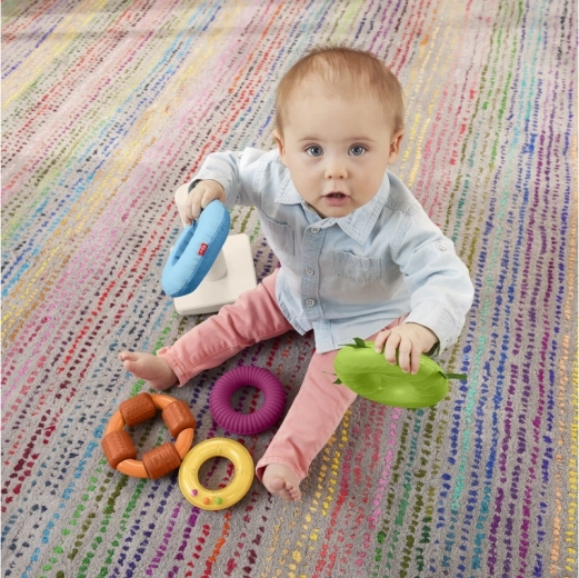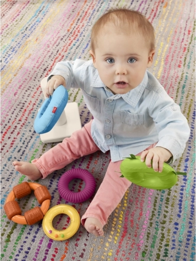 Ontdek het leuke stapelspeelgoed voor baby’s vanaf 6 maanden: de Fisher-Price sensorische piramide met 5 kleurrijke ringen met verschillende texturen. Stimuleert de fijne motoriek, oog-handcoördinatie en zintuiglijke waarneming. Dankzij de zachte oppervlakken, verschillende materialen en een rammelaar genieten kinderen van grijpen, schudden en stapelen op de wiegende basis.