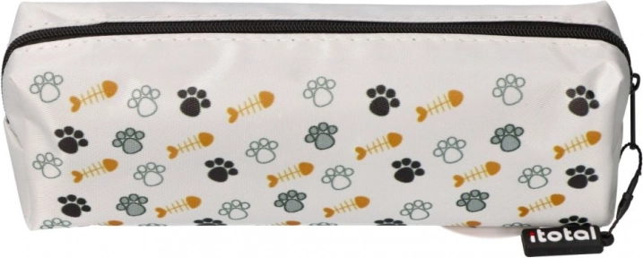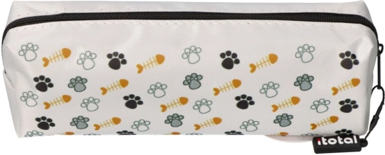De witte etui met een print van katten en pootafdrukken trekt de aandacht en geeft je schoolspullen een speelse stijl.