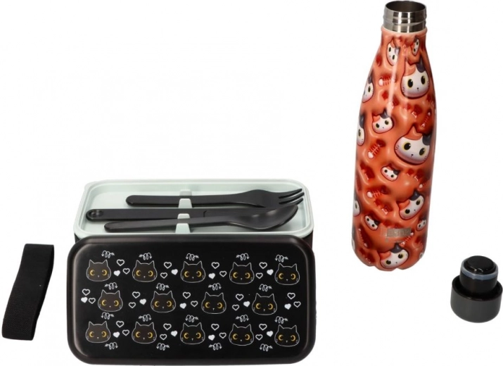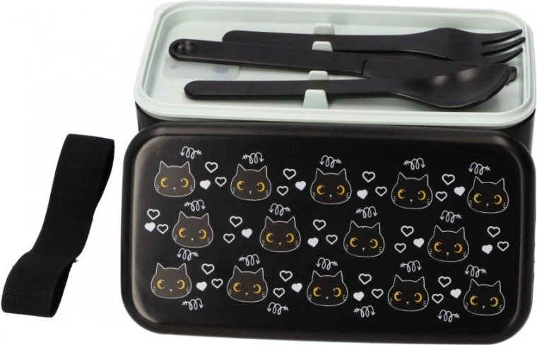 De elegante zwarte lunchbox met kattenmotief is ideaal voor werk, school en uitstapjes. Twee niveaus voor gescheiden porties houden het eten overzichtelijk en vers, terwijl het stevige deksel en de elastische band zorgen voor veilig vervoer zonder ongewenst openen.