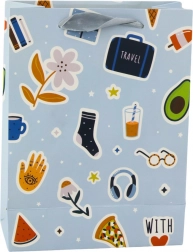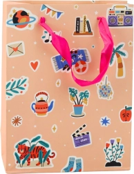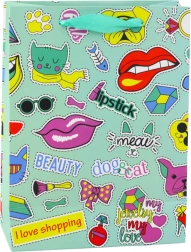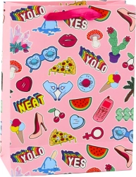 De cadeautas met stickerontwerp combineert verschillende grafische elementen zoals harten, lippen, fruit en teksten, wat het een jeugdige en originele uitstraling geeft. Gemaakt van stevig decoratief karton, zorgt het voor veilig vervoer van zelfs zwaardere cadeaus.