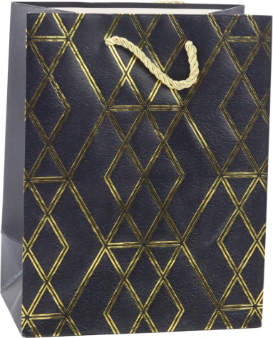 Het geometrische patroon van gouden lijnen past perfect bij de diepe zwarte achtergrond, wat het geheel een verfijnd karakter geeft. Deze tas is een uitstekende keuze voor verjaardagen, jubilea, feestdagen en andere bijzondere gelegenheden.