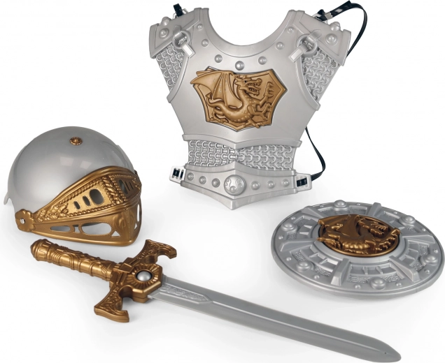 Helm, harnas, zwaard en schild vormen een complete set waarmee een kind klaar is voor elk avontuur – van carnaval tot heldhaftige gevechten thuis.