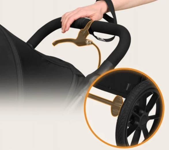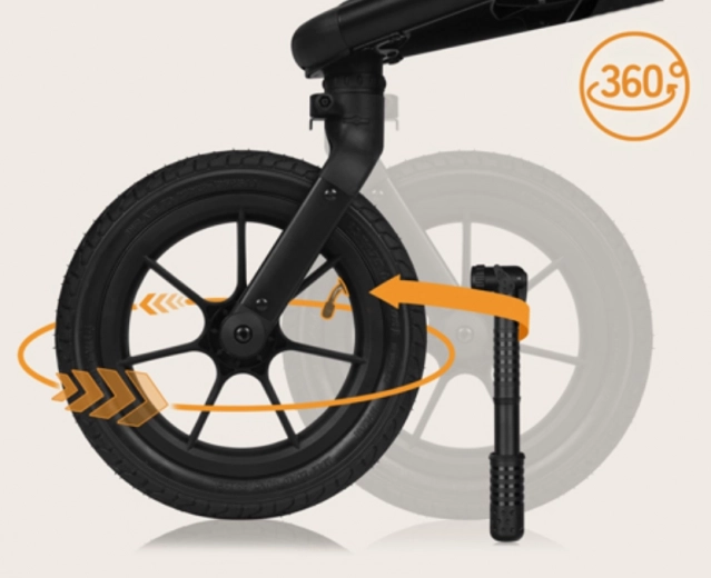 Grote met lucht gevulde wielen en een 360° zwenkend voorwiel met vergrendeling zorgen voor uitstekende wendbaarheid in de stad en op licht terrein, en voor een soepele, comfortabele rit voor het kind.