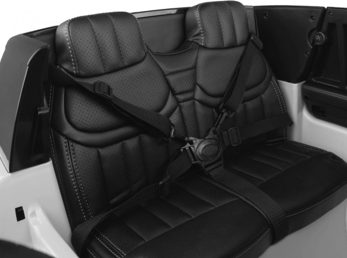 Binnenin vind je een comfortabele zitting van eco-leer met 5-puntsgordel, ruime zitplaats en praktische opbergruimte onder de motorkap. Zachte EVA-wielen dempen oneffenheden en zorgen voor een stille rit op stoep en gras. Voor de fun is er een kleurendisplay met touchpaneel, voorgeïnstalleerde liedjes, USB/SD, Bluetooth en radio – inclusief knoppen voor het wijzigen van nummers en volume.