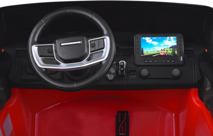 Het interieur verrast met een beklede zitting van eco‑leer, vijfpuntsgordels en een overzichtelijk dashboard met een schakelaar voor rijrichting vooruit/achteruit en een schakelaar voor 2x4/4x4‑aandrijving. Het kleurrijke multimediadisplay speelt liedjes en video’s (MP4) af vanaf USB of SD‑kaart, en biedt Bluetooth, radio en touchbediening.