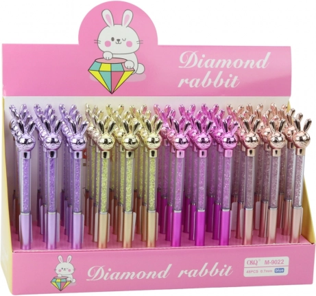 Stijlvolle balpen met konijntje en fonkelende steentjes. Blauwe vulling 0,7 mm, vloeiend schrijven. 4 kleuren, lengte 17 cm. Perfect voor school en als cadeau.