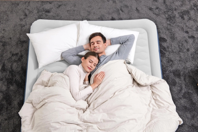 De dubbele pomp blaast het luchtbed in ca. 4 minuten op en behoudt tussentijds de ideale hardheid voor een rustige slaap zonder inzakken.