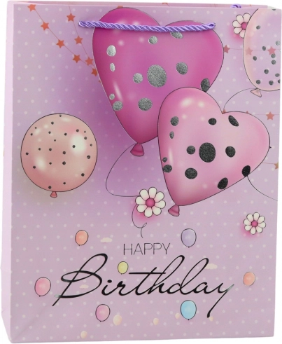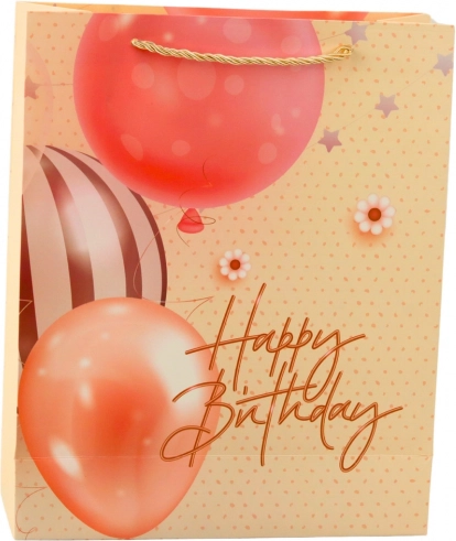 De cadeautas met vrolijk ballonnenmotief en de elegante tekst Happy Birthday is een uitstekende keuze voor elke verjaardag. Hij combineert een aantrekkelijk ontwerp in roze, blauw, paars en perzikkleur met een praktische uitvoering die ook zwaardere cadeaus veilig draagt.