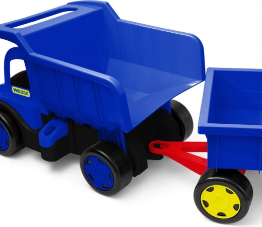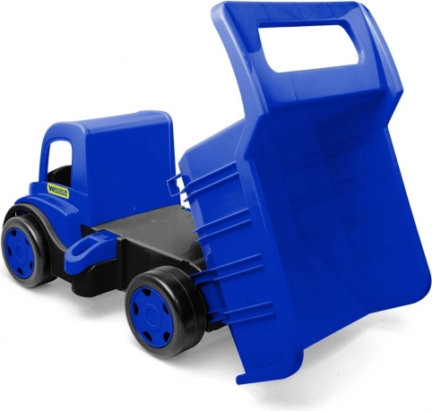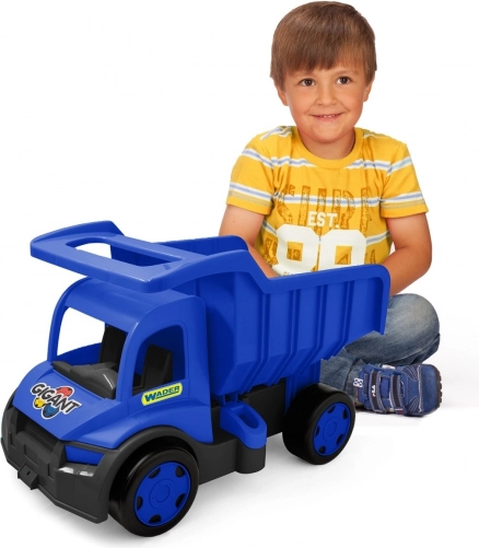 Robuuste kinder-kiepwagen GIGANT in donkerblauw met een lengte van 55 cm, ideaal voor jonge bouwers thuis en buiten. Heeft een openende kiepbak met praktisch handvat, twee trekhaakogen voor en achter voor het aansluiten van een aanhanger of om te trekken, en een uitzonderlijk duurzame constructie met een draagvermogen tot 150 kg.