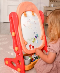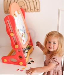 Het dubbelzijdige WOOPIE-bord stimuleert creativiteit, fijne motoriek en het leren van letters en cijfers op een speelse manier. De ene zijde is een wit magnetisch bord voor droog uitwisbaar schrijven, de andere een krijtbord. Dankzij de hoogteverstelling pas je het gemakkelijk aan de groei van het kind aan.