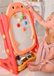 Alles wat kinderen nodig hebben is inbegrepen: magnetisch alfabet en cijfers, stiften, krijtjes, spons, een praktische plank en beker voor hulpmiddelen en twee bordspellen voor gezamenlijk plezier. De compacte afmetingen maken plaatsing in de kinderkamer eenvoudig.
