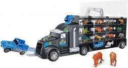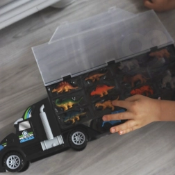 Ontdek de multifunctionele vrachtwagen die tegelijk een praktische koffer en een leuke lanceerstation is. De dubbelzijdige laadbak met transparante klep biedt plaats aan in totaal 24 figuurtjes of autootjes, zodat elk item zijn plek heeft en niets zoekraakt. De set bevat 6 dinosaurussen, 6 dieren, een klein autootje en een helikopter – allemaal klaar voor direct speelplezier.