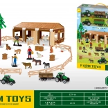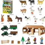 De complete set bevat dieren, drie figuurtjes, twee tractoren met afneembare aanhangers, een schuur, hekken en veel accessoires – alles voor het bouwen van je eigen boerderij.
