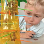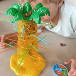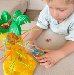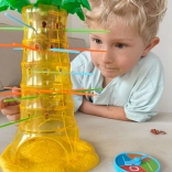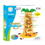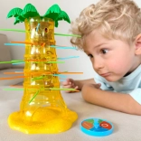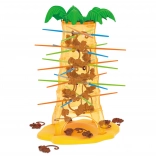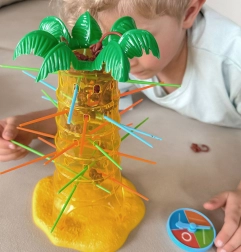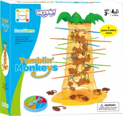 In dit geweldige spel van het merk Woopie steek je stokjes in de gaten van de palmboom en gooi je aapjes erop. Bij elke beurt draai je aan het wiel en de pijl bepaalt welk stokje je moet uittrekken. Het doel is om de aapjes zo lang mogelijk in de boom te houden en niet te laten vallen. De winnaar is degene die de minste aapjes laat vallen.
