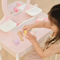 De praktische lade en zijplankjes bergen alle schatten op. Inclusief een uitgebreide set houten accessoires: palet met kwastje, lippenstift, nagellakken, parfum, kam, zachte poederkwast en föhn. Het speelgoed heeft gladde randen en een afwerking met niet‑giftige verven voor veilig spelen.