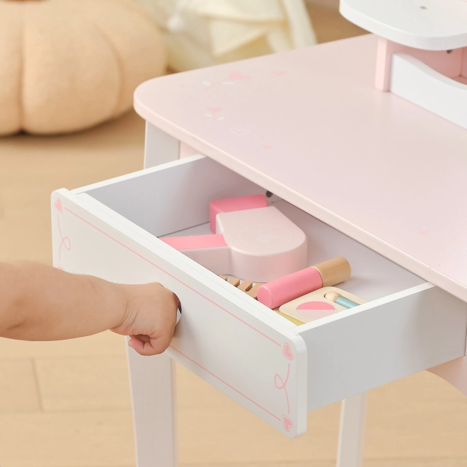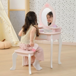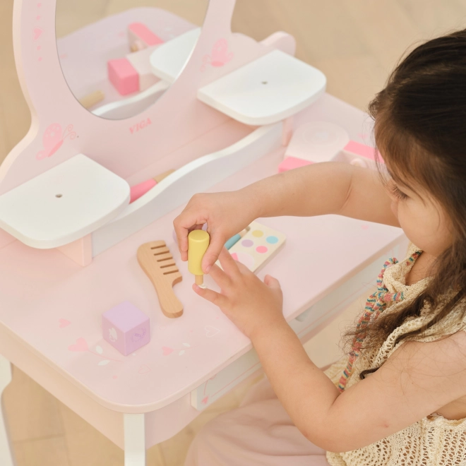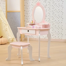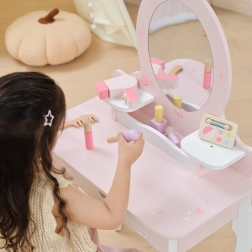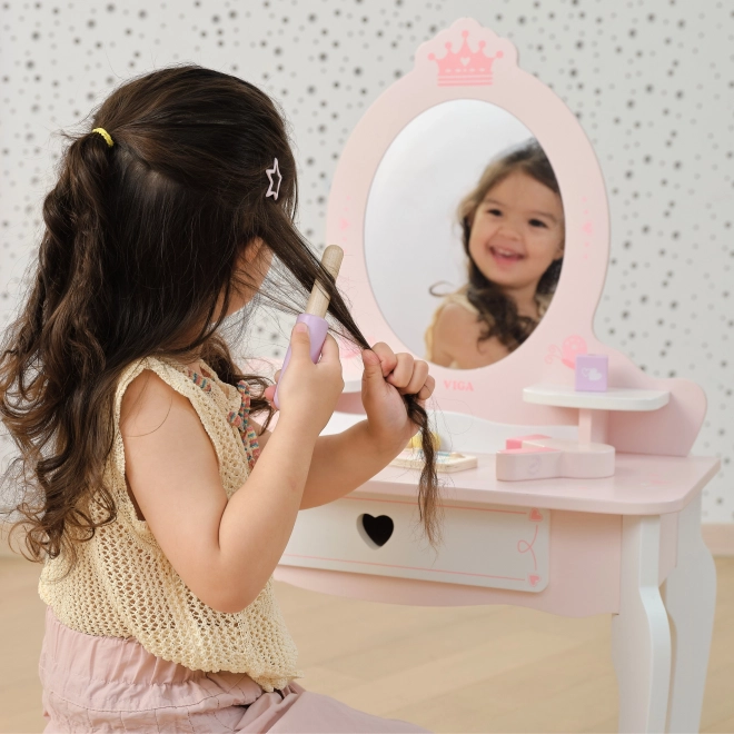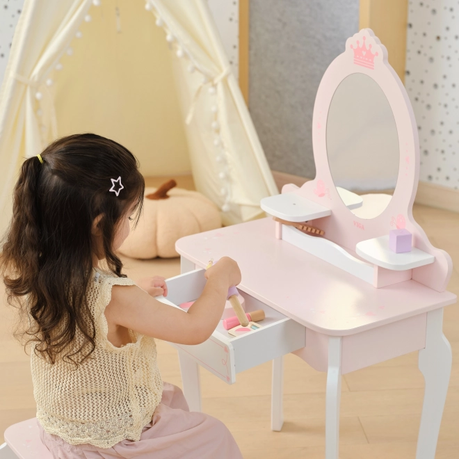 Een betoverende houten kinderkaptafel in roze‑wit van Viga tovert elke kamer om tot een klein koninkrijk. Voorzien van een veilig spiegel met kroontje, een comfortabel krukje, een ruime lade en een set houten cosmetische accessoires. Dankzij de hoogwaardige afwerking, gladde randen en niet‑giftige verven is het ideaal voor creatieve en rollenspellen van kinderen.