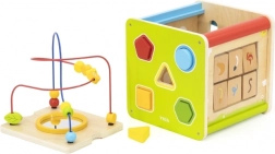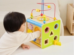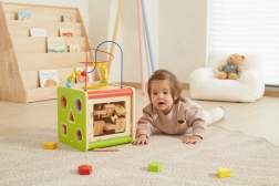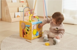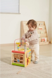 Massief hout en glad afgewerkte randen zorgen voor veilig gebruik, terwijl de intense kleuren en leuke mechanismen de aandacht van kleine ontdekkers langdurig vasthouden. De kubus is ideaal voor zelfstandig spel en voor samen met ouders.