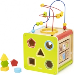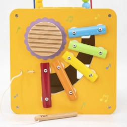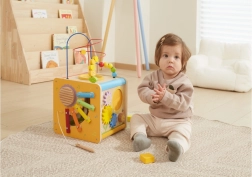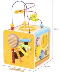 Ontdek de wereld van kleuren, vormen en geluiden met deze houten educatieve 5-in-1 kubus. Hij biedt een kralendoolhof, een vormenstoof, tandwielen, een klok met beweegbare wijzers en een muziekpaneel met xylofoon. De stabiele houten constructie, levendige kleuren en doordachte details ondersteunen de fijne motoriek, oog-handcoördinatie, logisch denken en creativiteit van kinderen vanaf circa 18 maanden.