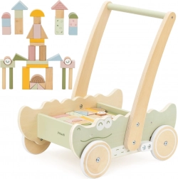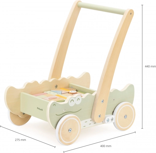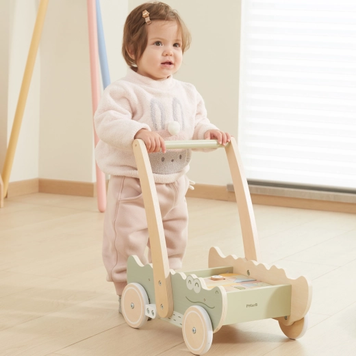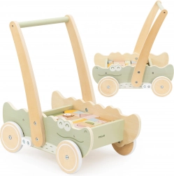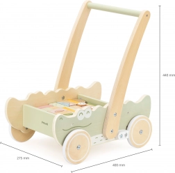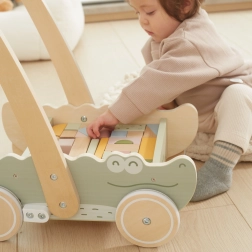 Ervaar de vreugde van de eerste stapjes met de krokodil-loodswagen. De stabiele houten constructie biedt de nodige ondersteuning en stelt kinderen in staat de wereld om hen heen veilig te verkennen. De wagen is uitgerust met een ergonomische handgreep, die kinderen helpt hun evenwicht te bewaren.