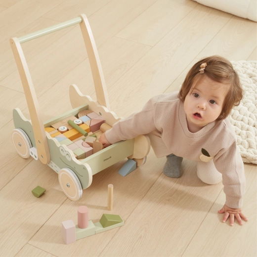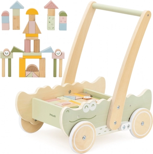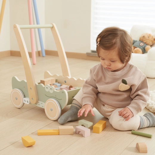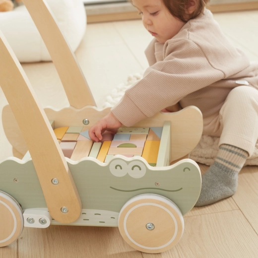 Kleurrijke blokken in verschillende vormen en pastelkleuren stimuleren niet alleen speelse creativiteit, maar ontwikkelen ook de fijne motoriek. Zachte rubberen wieltjes beschermen vloeren en zorgen voor een soepele beweging. Deze krokodil met zijn schattige ontwerp en zachte kleuren wordt het favoriete speelgoed van ieder kind!