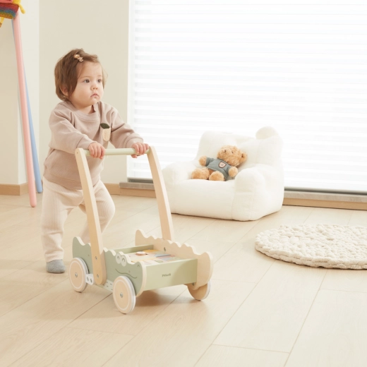De houten constructie biedt stevige ondersteuning voor kleine voetjes, waardoor het kind veilig kan leren lopen.