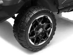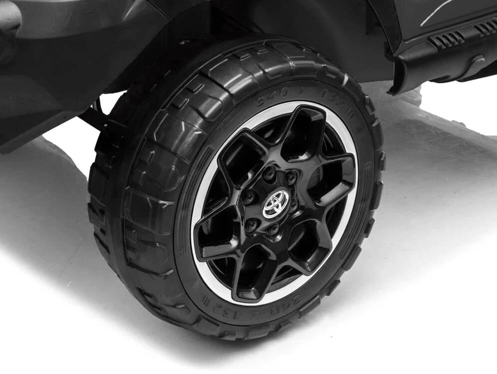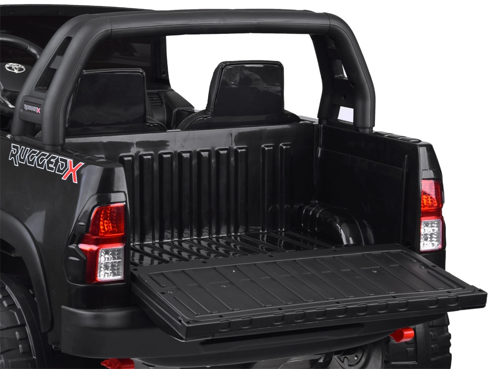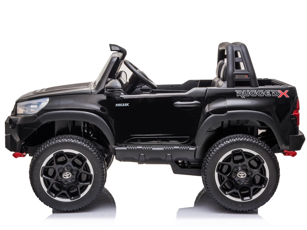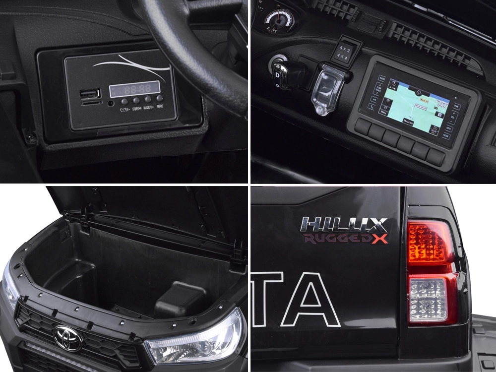 De robuuste Toyota Hilux voor kinderen is een ruime, tweezits gelicentieerde TOYOTA-uitvoering met realistische details, te openen deuren en motorkap en een grote achterkoffer. Dankzij de schakelbare 2x2 / 4x4 aandrijving en 3 snelheden kan hij overweg met gras, oneffenheden en kleine hellingen. Starten met een metalen sleutel gaat gepaard met een motorgeluid voor een nog authentiekere beleving.