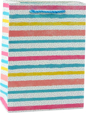 Deze cadeauzak is gemaakt van duurzaam decoratief karton, wat zorgt voor stevigheid en een mooie uitstraling. De motieven met kleurrijke hartjes, sterretjes, stippen en strepen geven de tas een lichte en speelse look, passend bij verschillende soorten cadeaus. De sterke koordhandvatten in bijpassende kleur maken dragen comfortabel.