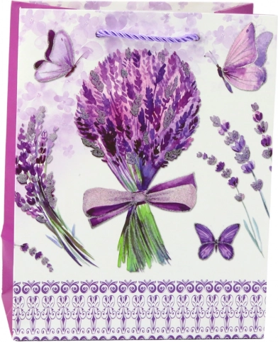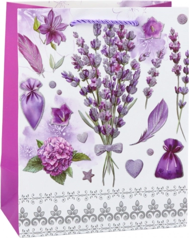 Papieren cadeautas met lavendelmotief is een elegante en stijlvolle oplossing voor het inpakken van kleine tot middelgrote cadeaus.