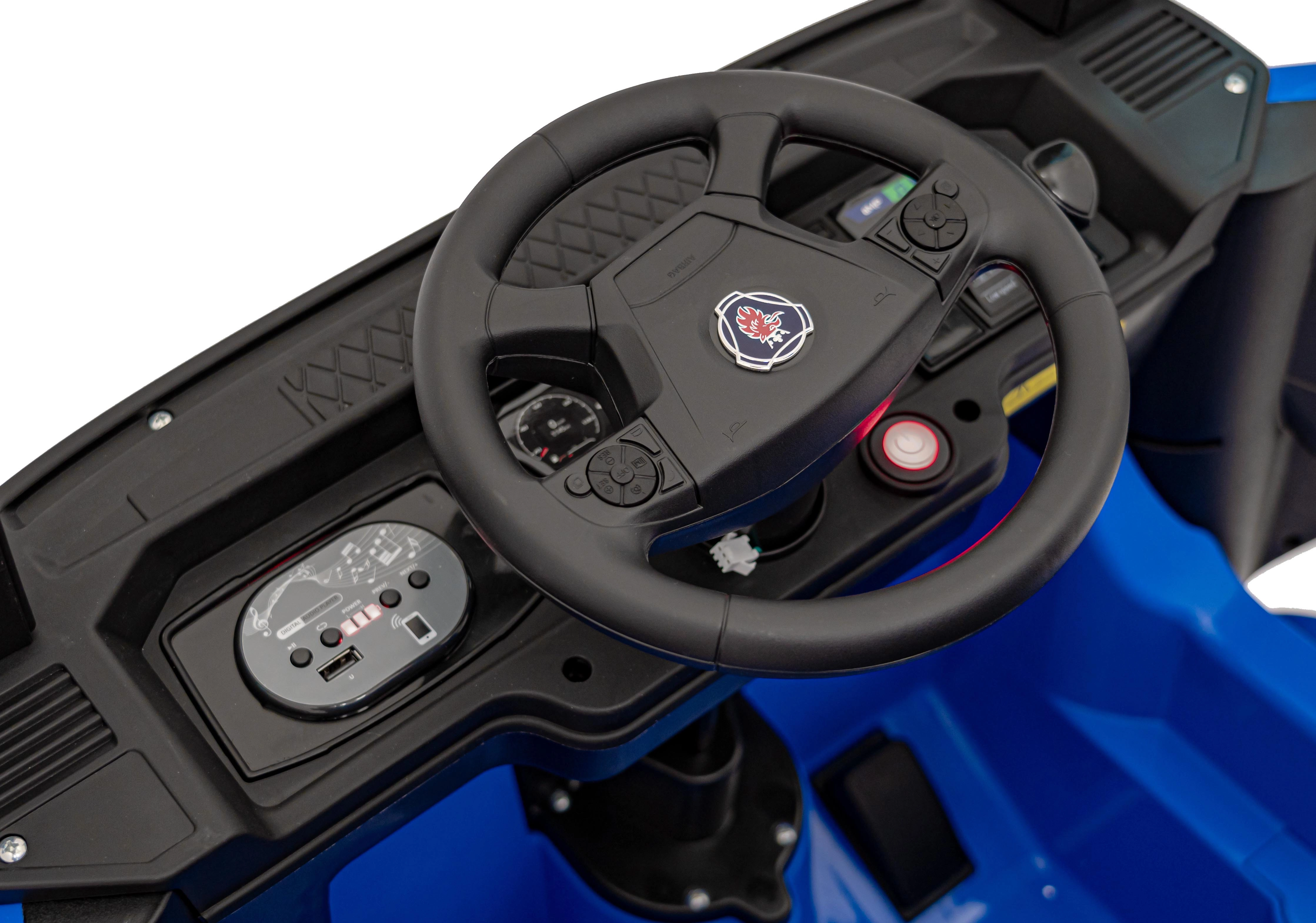 - Audiopaneel: ondersteunt MP3, Bluetooth, USB-invoer; bovendien knoppen voor geluiden en claxon op het stuur met voorgeprogrammeerde melodieën.