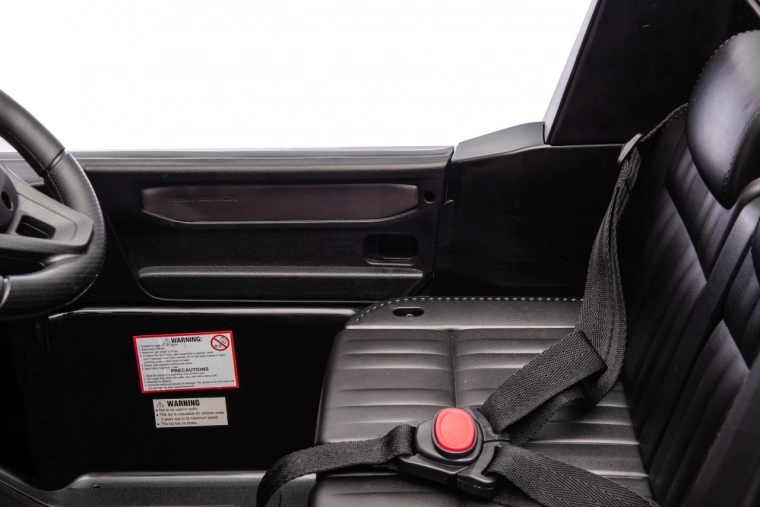 Het zitje van eco-leer met veiligheidsgordels houdt de kleine bestuurder stevig op zijn plek. Deurtjes die open kunnen maken in- en uitstappen eenvoudig.