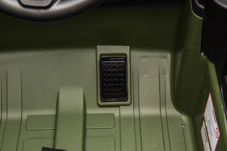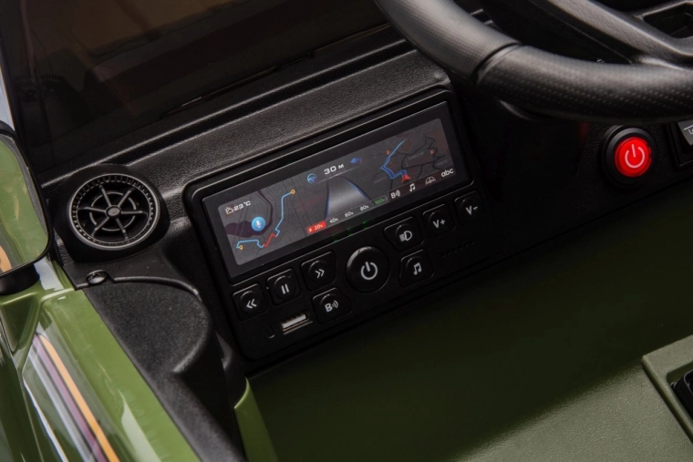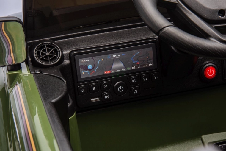 EVA-schuimwielen (24 × 9 cm) garanderen een stille en comfortabele rit, zelfs op ruwer terrein. Functionele voorste LED-lampen met schakelaar, openende deuren en een verhoogd onderstel met 17 cm bodemvrijheid geven de auto een realistisch karakter. De laadniveau-indicator houdt het energieniveau in het oog.