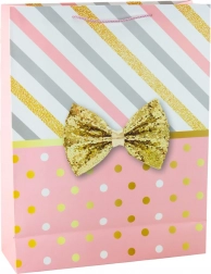 Grote cadeautas met een uniek ontwerp van strepen en stippen in goud, aangevuld met een decoratieve strik.