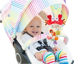 De krab bevat 9 functies in 1 product, zoals een rammelaar, bijtring, piepertje, knisperende pootjes, spiegel met reflecterend effect en meer. Het speelgoed kan eenvoudig worden bevestigd met de universele clip aan een kinderwagen, wieg, autostoeltje of wipstoeltje.