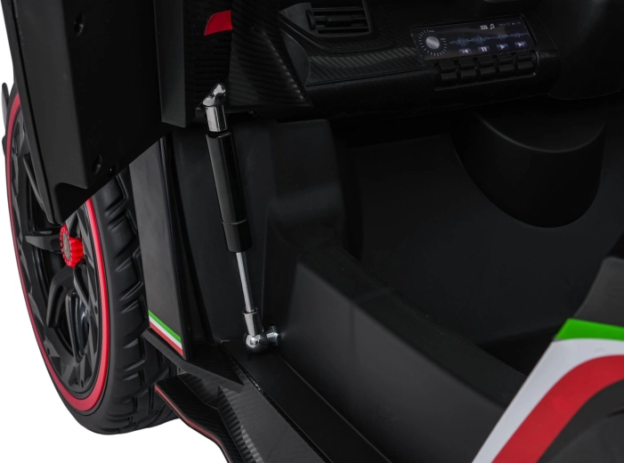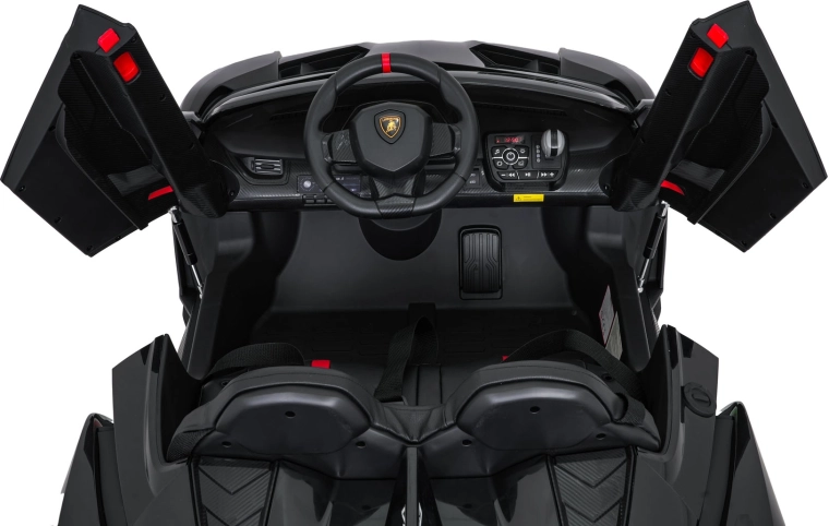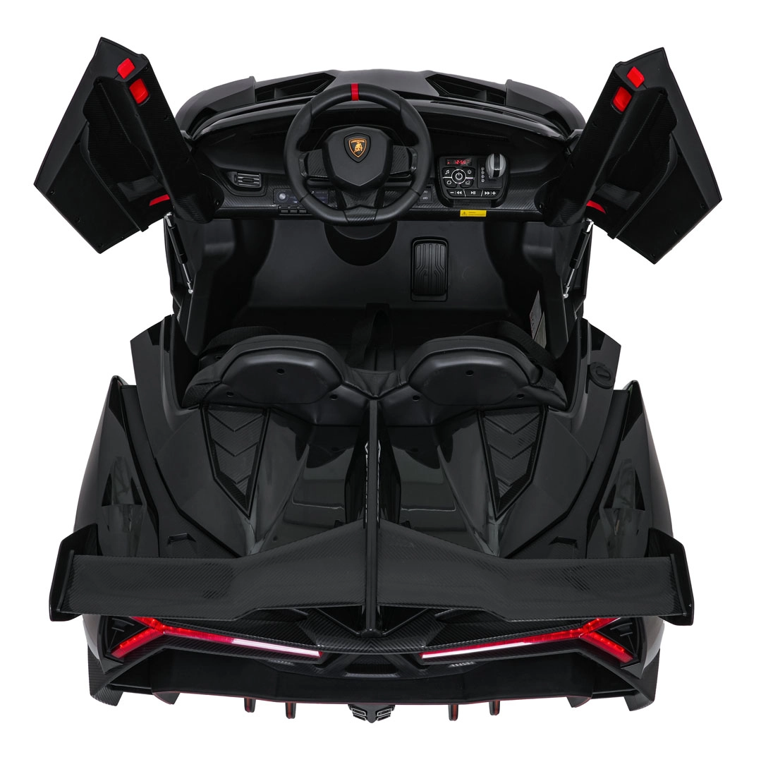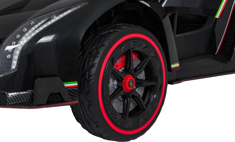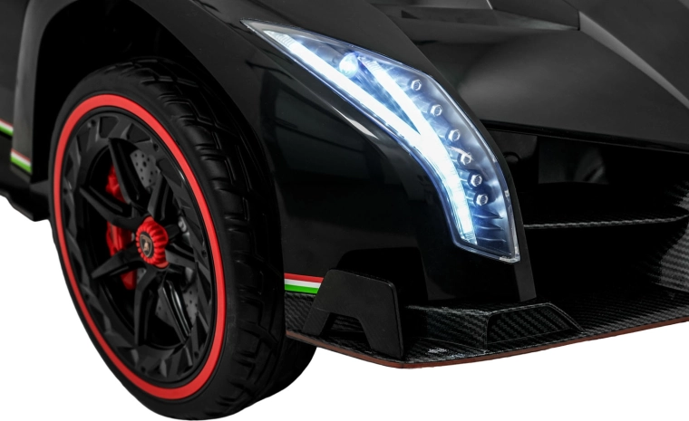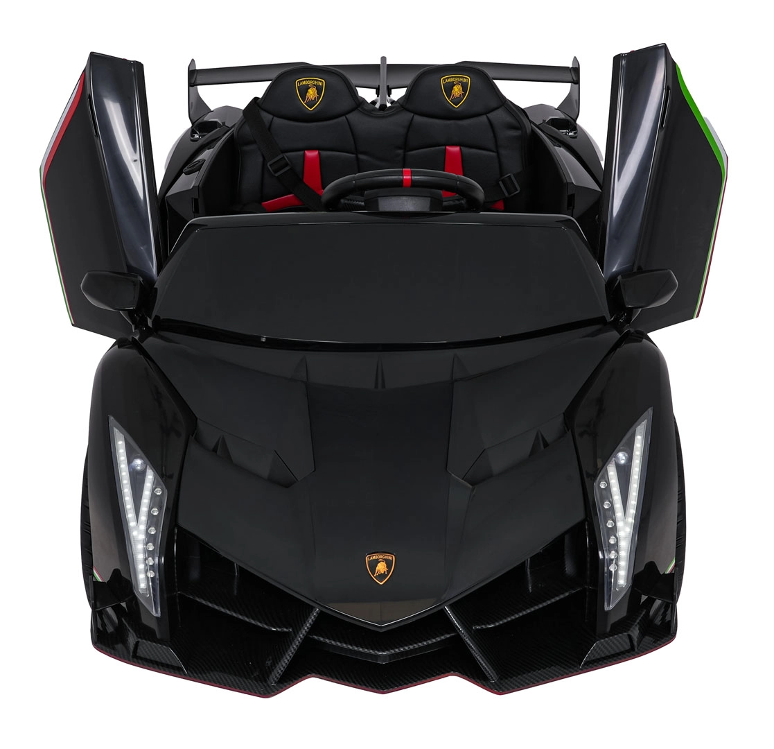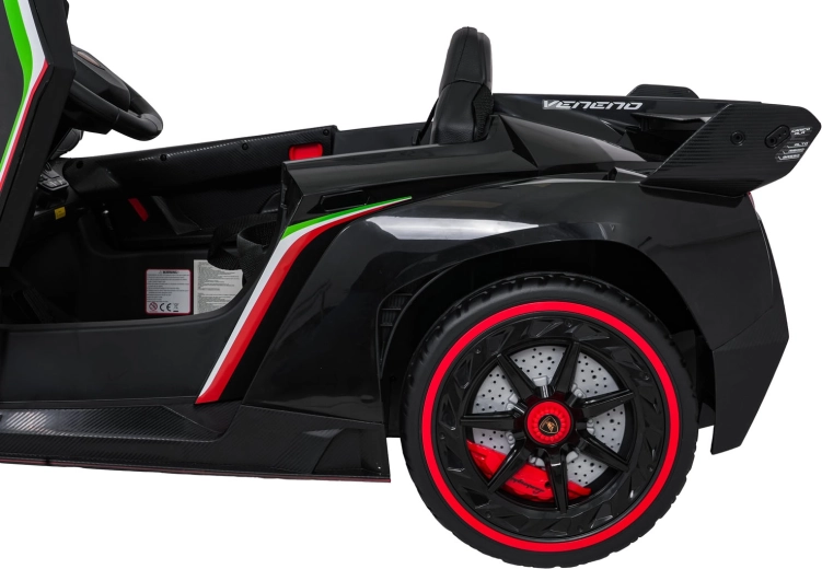Stijlvol elektrisch speelgoed voor kinderen, geïnspireerd door de supercar LAMBORGHINI VENENO, met 4×45 W motoren, een dubbele 12 V-accu, schaar­deuren die open kunnen, LED-verlichting voor en achter, zachte EVA-banden en een lederen zitje met veiligheidsgordels. Ouders waarderen de 2,4 GHz afstandsbediening met noodstop, kinderen genieten van Bluetooth/MP3/USB en FM-radio.