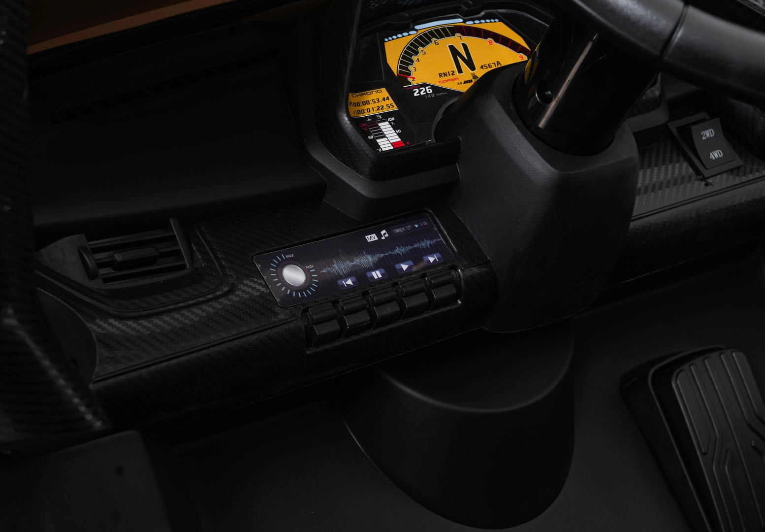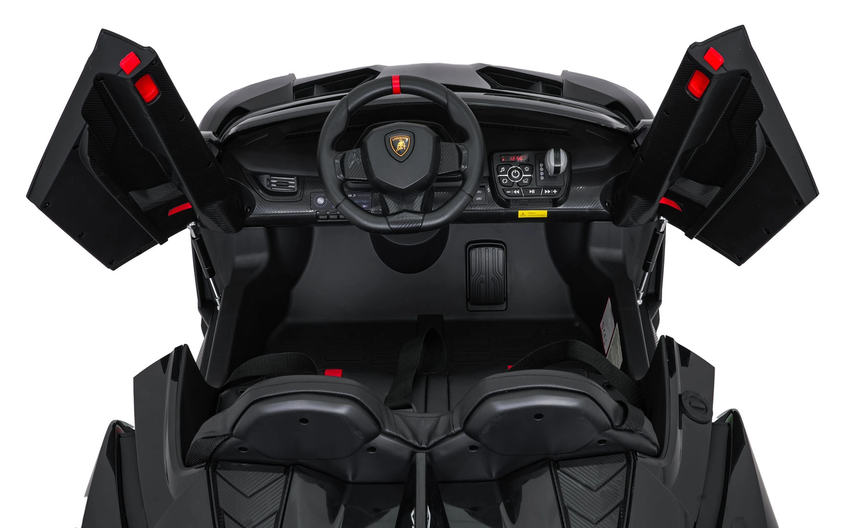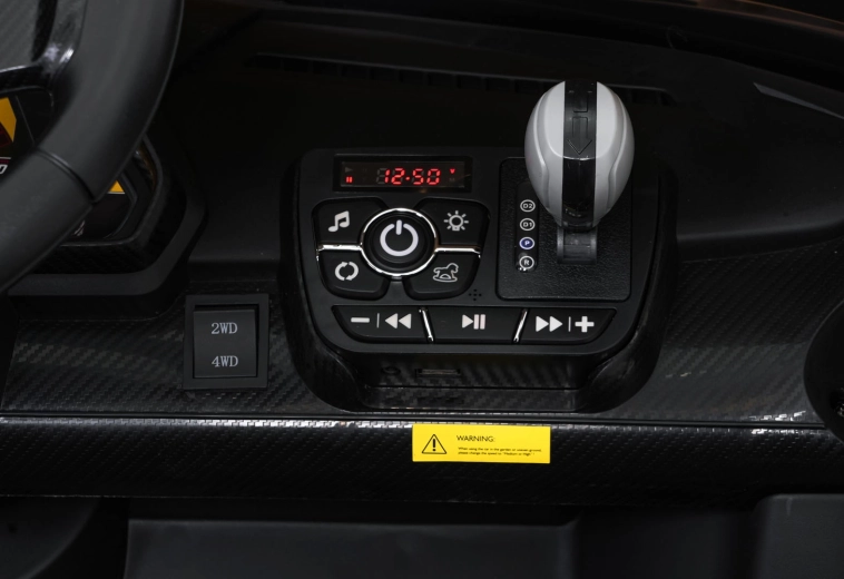 Het realistische design wordt versterkt door te openen schaar­deuren, werkende LED-verlichting, sportieve details en een tweezits stoel van eco-leer met veiligheidsgordels. Besturing is intuïtief vanuit de cockpit (stuur, pedaal) en kan ook volledig door ouders worden overgenomen met de 2,4 GHz afstandsbediening met STOP-knop voor direct stoppen.