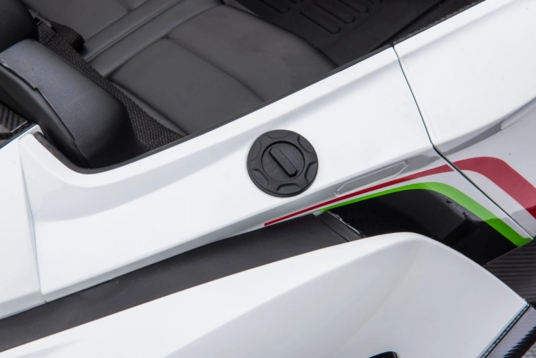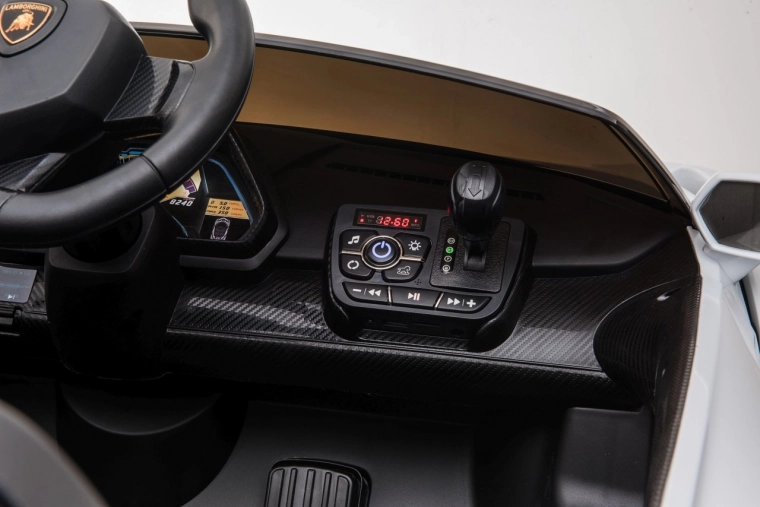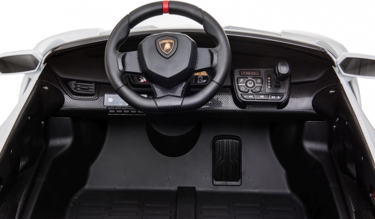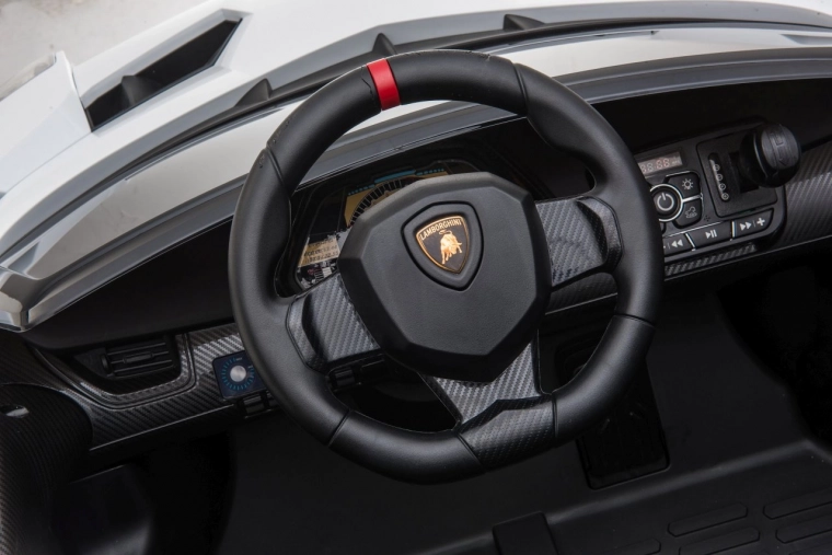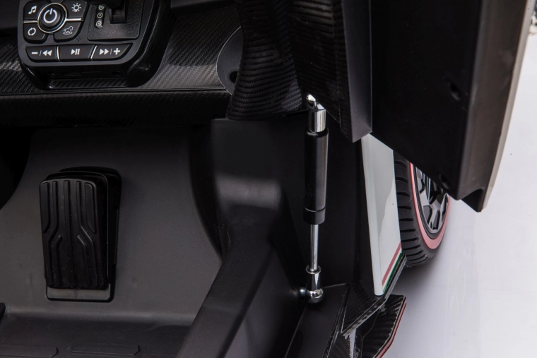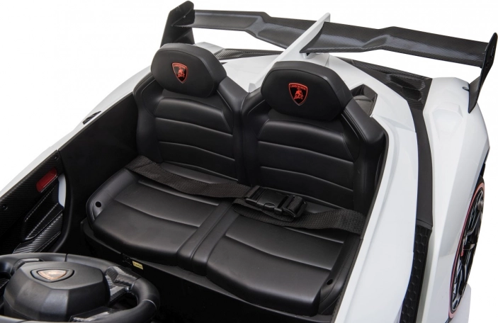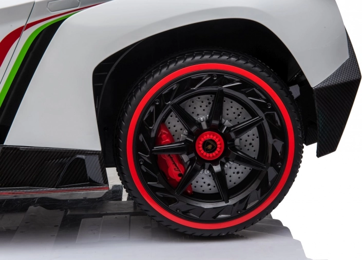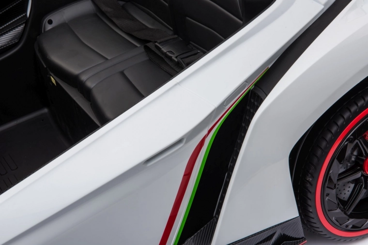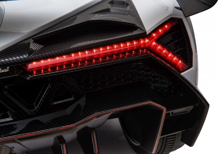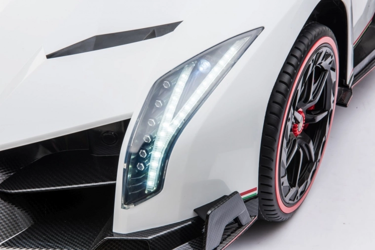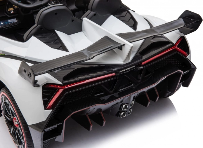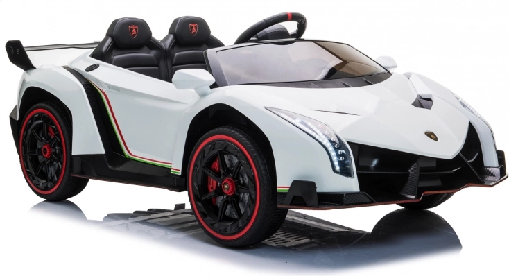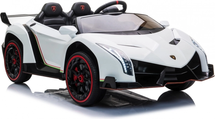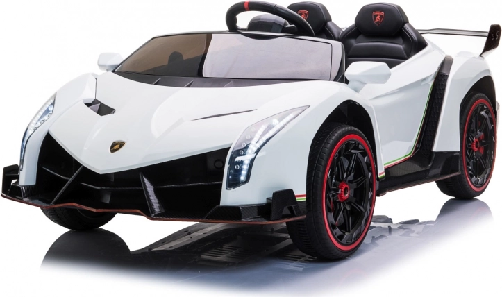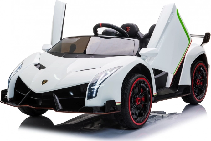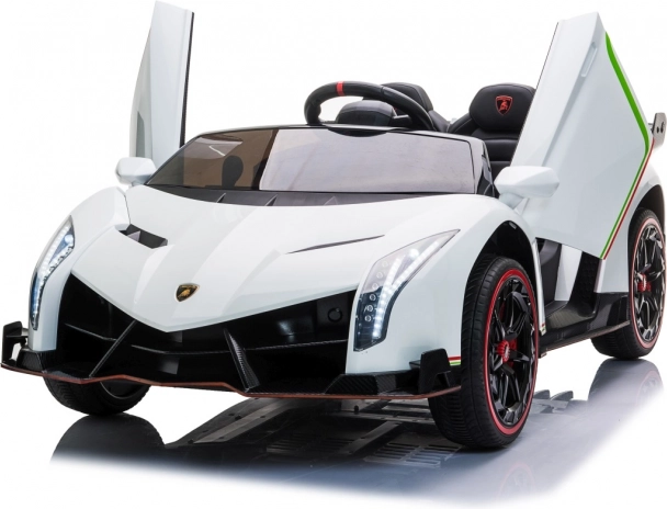 Stijlvolle elektrische kinderauto LAMBORGHINI Veneno in het wit met 4×45 W motoren, dubbele accu 12 V 7 Ah ×2, EVA-schuimbanden en te openen deuren. Dankzij soepel wegrijden, 2 snelheden vooruit/achteruit en 2,4GHz afstandsbediening met een veiligheidsStop-knop is rijden veilig en comfortabel. Luxe wordt onderstreept door een kunstleren zitting met gordels, LED-verlichting voor en achter en een uitgebreide audiopaneel met MP3, Bluetooth, FM en USB.