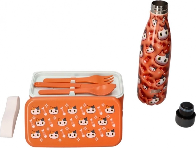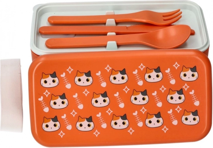 Praktische en schattige oranje lunchbox met kattenmotief, ideaal voor lunch op werk, school en onderweg. Inclusief geïntegreerd bestek – lepel en vork. Biedt ruimte voor een dagportie, is geschikt voor de vriezer en kan in de magnetron worden opgewarmd zonder deksel (max. 100 °C). Compacte afmetingen 20 × 10,6 × 10 cm maken meenemen in tas of rugzak gemakkelijk.