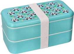 Stijlvolle tweelaagse bentobox in turquoise met een speels pandamotief houdt je eten vers en gescheiden. Dankzij de compacte afmetingen 20 × 10,6 × 10 cm past hij in een schooltas of werktas, en de elastische band houdt alles betrouwbaar bij elkaar.