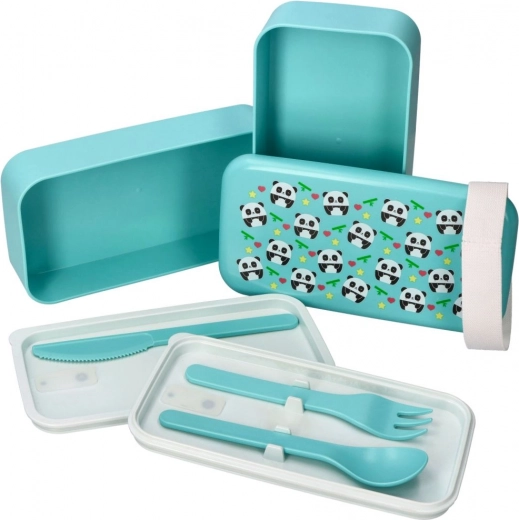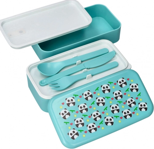 Schattige lunchbox met pandamotief en een inhoud van 1,2 l, ideaal voor lunches naar school, werk en onderweg. Biedt twee gescheiden lagen, een praktische bestekset met vork, mes en lepel en een veilige bevestiging met elastische band. Geschikt voor de vriezer en voor opwarmen in de magnetron zonder deksel (max. 100 °C).