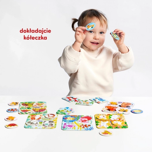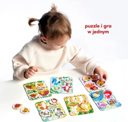 Ontdek leuke kinderlegpuzzels die tegelijk een eerste eenvoudig spel zijn. In de doos vind je 6 vierdelige puzzels met dieren en 12 ronde fiches om te combineren. Ideaal voor de ontwikkeling van fijne motoriek, waarneming en geduld – en daarna hup, door naar het allereerste bordspel met jullie voltooide plaatjes!