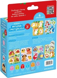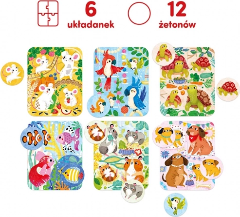 Lieve illustraties van favoriete huisdieren – muisjes, hondjes, visjes, hamsters, schildpadden en parkieten – nodigen uit om te puzzelen én om voor het eerst te spelen. Eerst leggen kinderen 6 vierdelige scènes, daarna koppelen ze daar 2 thematische fiches aan en veranderen ze de puzzels in een eenvoudig spel voor reactie en koppelen.