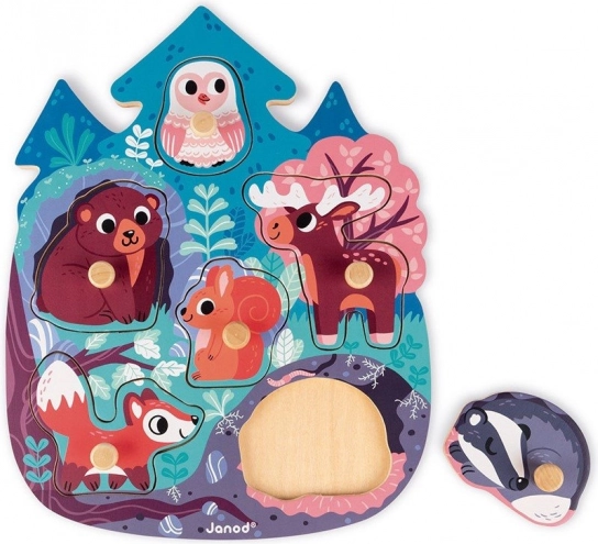 Deze kleurrijke houten insteekpuzzel is een ideale eerste puzzel voor de allerkleinsten. Tijdens het spelen oefenen kinderen oog-handcoördinatie, leren ze vormen herkennen en ontdekken ze de wereld van bosdieren. Elk stukje heeft een praktisch houten knopje voor gemakkelijk vastpakken met kleine handjes.
