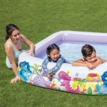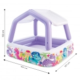 Het INTEX opblaasbare kinderzwembad met kleurrijke dinosaurusprint is ideaal voor hete dagen. Dankzij de afneembare opblaasbare overkapping spelen kinderen in de schaduw en waarderen ouders het gebruiksgemak en de veilige uitvoering. De afmetingen 157 × 157 × 122 cm en de capaciteit van 295 l bieden volop ruimte om te verfrissen en te spelen.