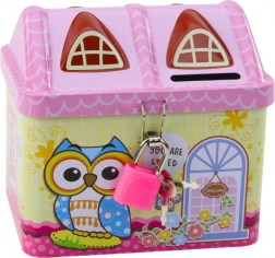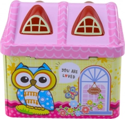 Spaarpot in de vorm van een huisje met uilenmotief in pastelkleuren spreekt elk kind aan.
