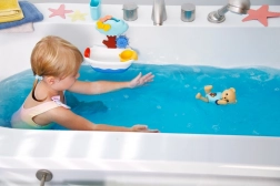 Teddybeer met zachte vormen is veilig voor de kleintjes, ligt goed in de hand en drijft uitstekend. Kleurrijke elementen stimuleren de fijne motoriek, zintuiglijke waarneming en logisch denken bij het ontdekken van waterstromen.
