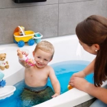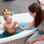 Draai Emma’s armen naar achteren, laat los en kijk hoe ze zelf door het water beweegt. Ideaal voor bad, peuterbadje en zwembad.