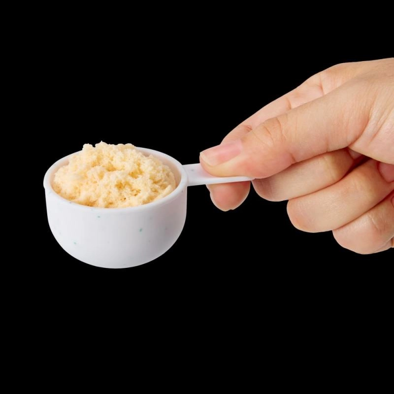 Stevige kunststof beker met ergonomisch oor en maataanduidingen leert kinderen hoeveelheden inschatten. De spatel helpt bij het mengen en serveren.